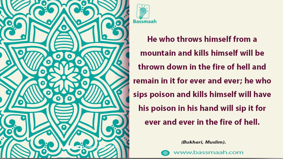 . He who throws himself from a mountain and kills himself will be thrown down in the fire of hell and remain in it for ever and ever; he who sips poison and kills himself will have his poison in his hand will sip it for ever and ever in the fire of hell